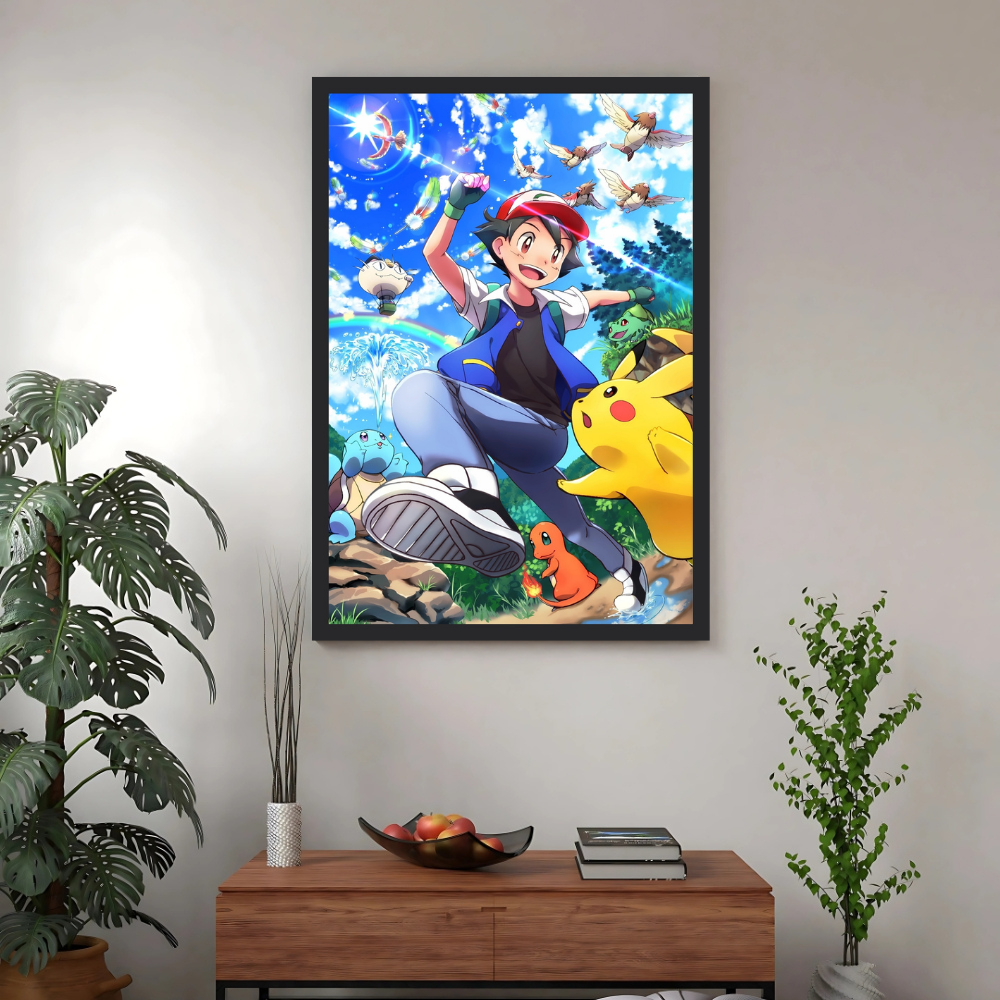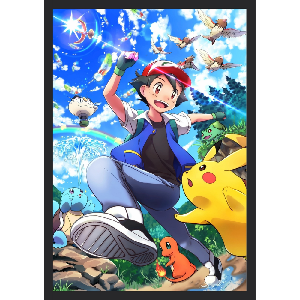 + Free ShippingAsh Ketchum runs enthusiastically with Pikachu and his Kanto starter Pokémon (Squirtle, Charmander) under a bright, sunny, blue sky.