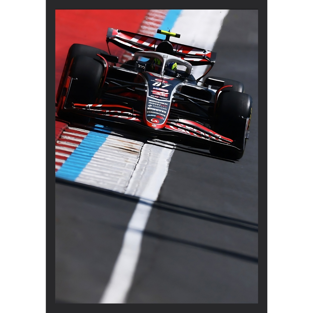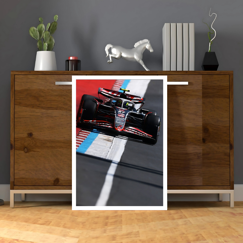 + Free ShippingA black and red F1 car accelerates out of a corner, passing over the red, white, and blue painted kerbs.