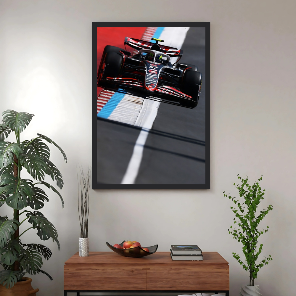 Showcase the bold design of the Haas VF-24 with this striking frame. Perfect for fans who admire determination and grit on the F1 grid.