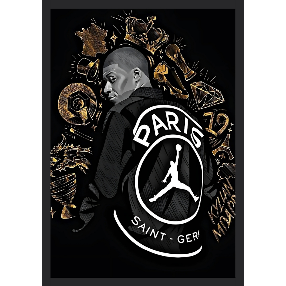 + Free ShippingAn artistic illustration of Kylian Mbappé in a black jacket with ‘Paris Saint-Germain’ and various trophies in gold sketch.