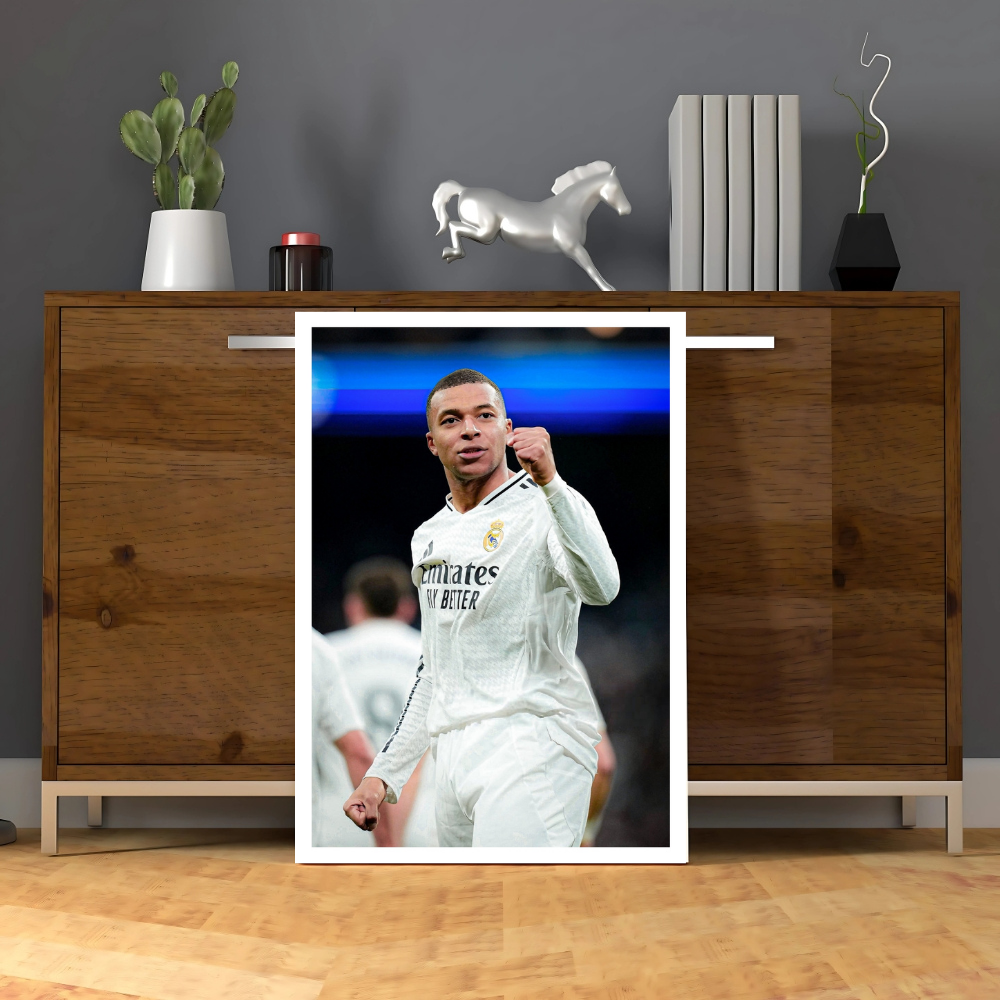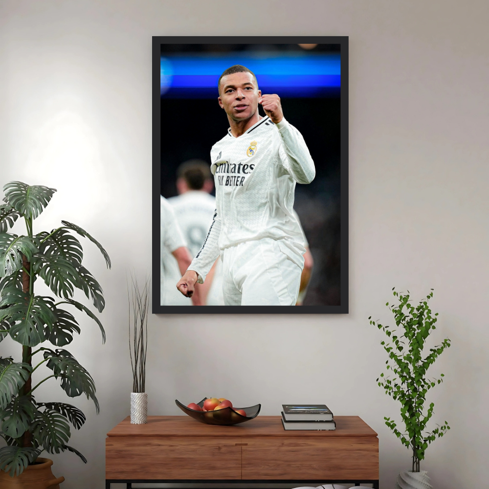 + Free ShippingKylian Mbappé celebrates a goal with a pumped fist in his white football club jersey.