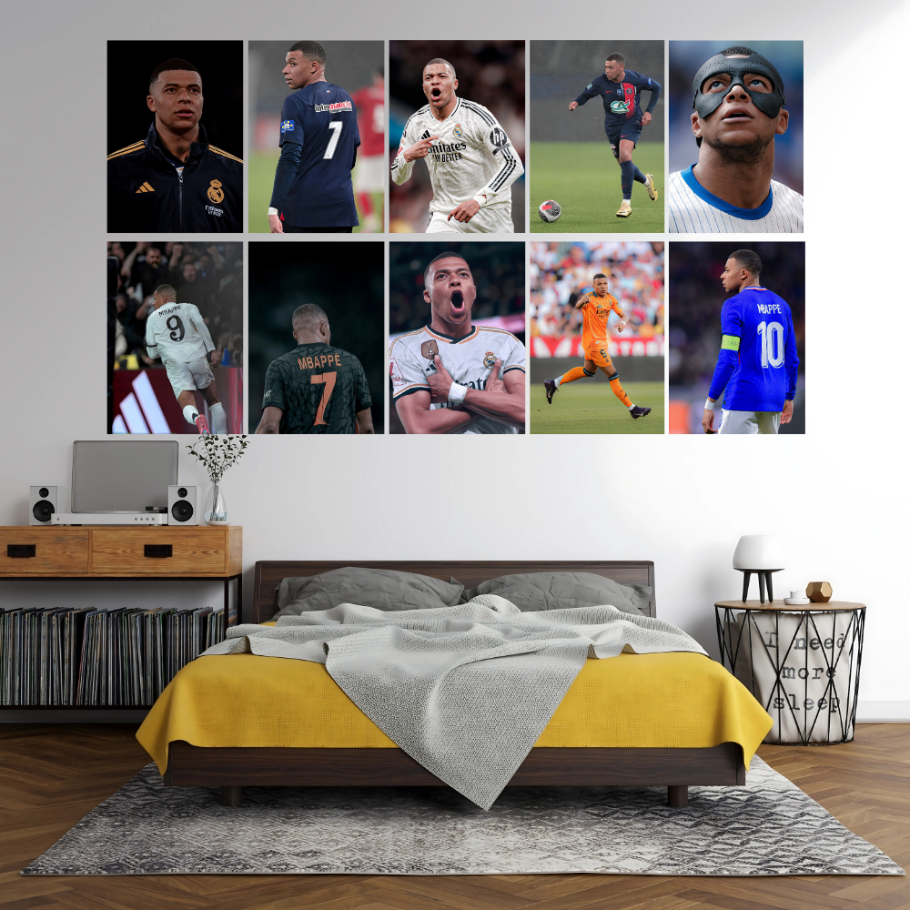Explore dynamic Kylian Mbappé posters capturing his speed, skill, and iconic football moments, perfect for fans who admire his electrifying style.