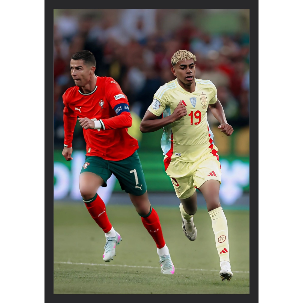 Celebrate a historic clash of generations with this special frame featuring Lamine Yamal and Cristiano Ronaldo in the Nations League. A tribute to the rise of Spain’s wonderkid and the legacy of Portugal’s legend, captured in one unforgettable moment.