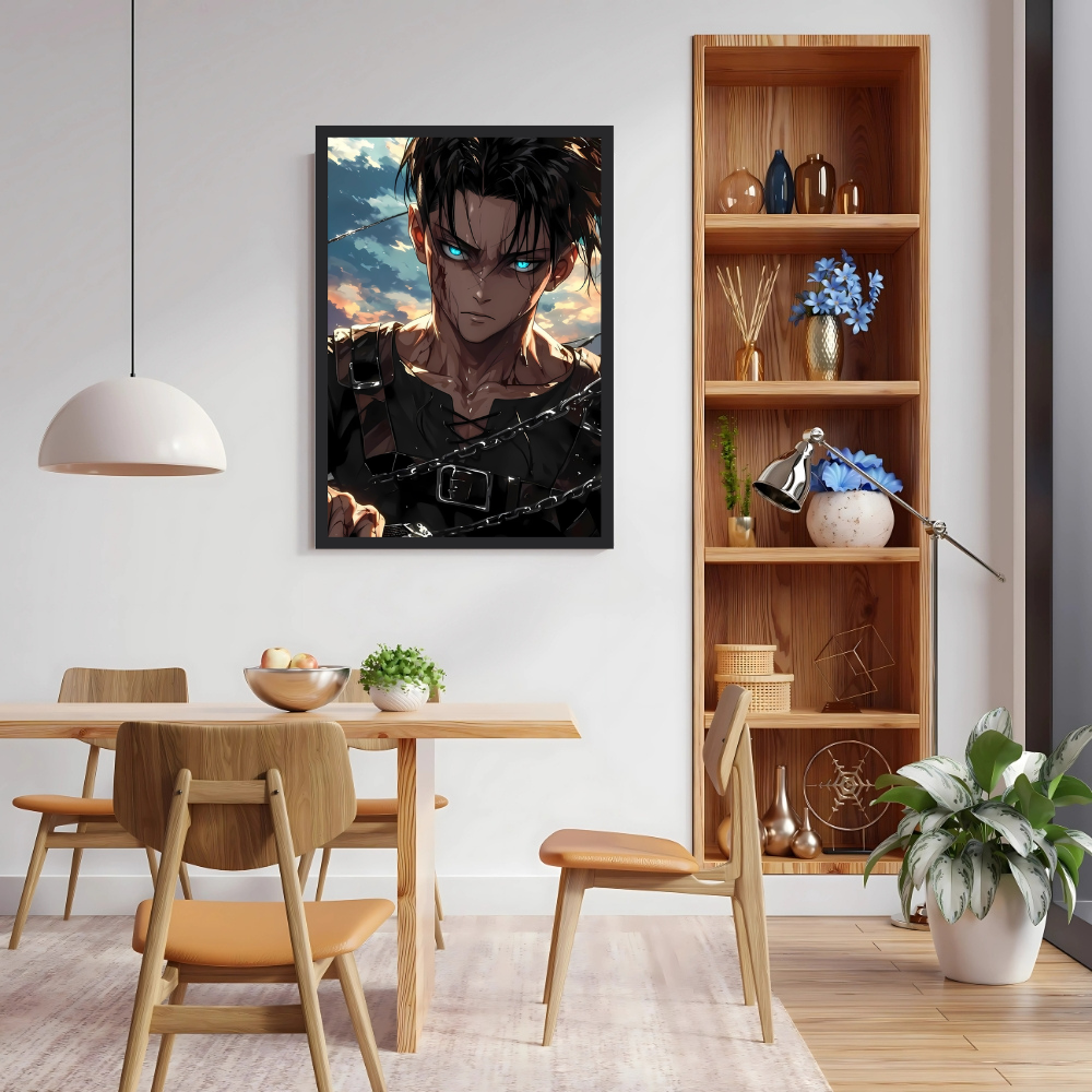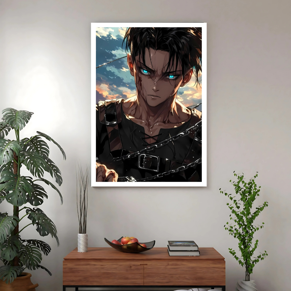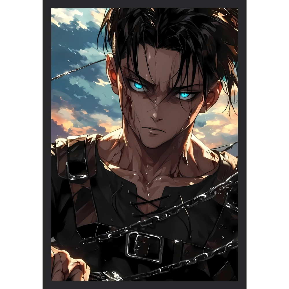 + Free ShippingA close-up of a battle-worn Levi, stripped down to his inner shirt and harnesses, featuring glowing blue eyes and blood streaks with a chain motif.