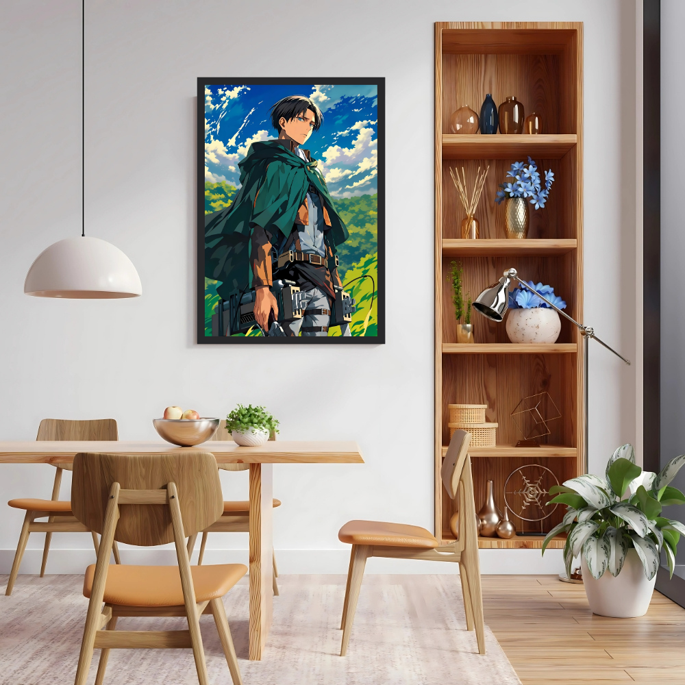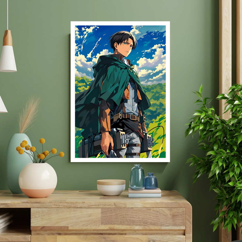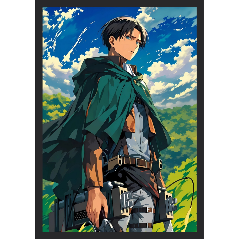 + Free ShippingLevi stands full-body in his Survey Corps uniform, holding his ODM gear against a bright blue sky with white clouds and green forest backdrop.