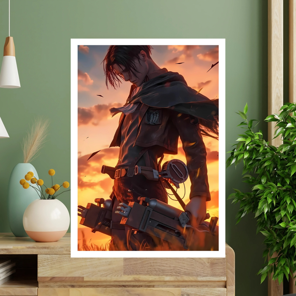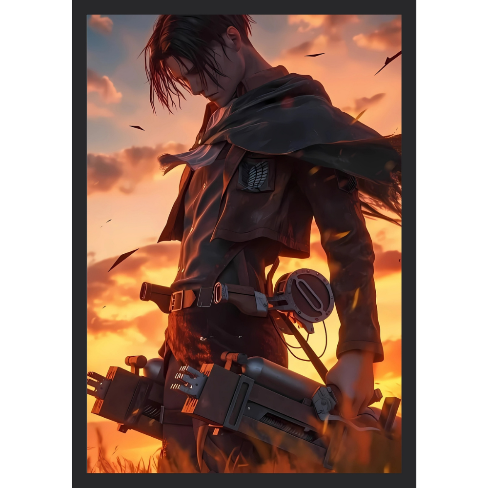 + Free ShippingLevi looks down with a somber expression, carrying his ODM gear against a dramatic, fiery orange sunset, with wind blowing debris.