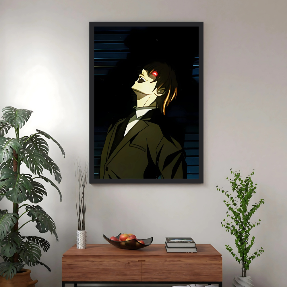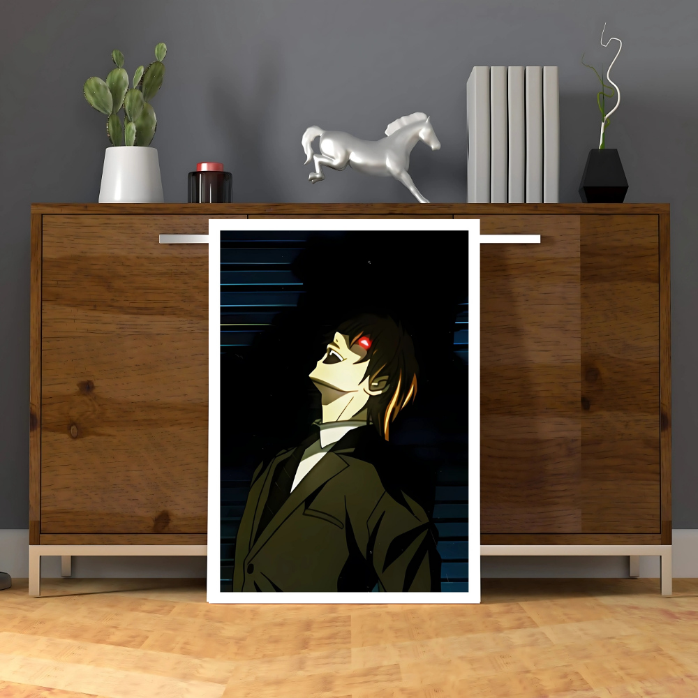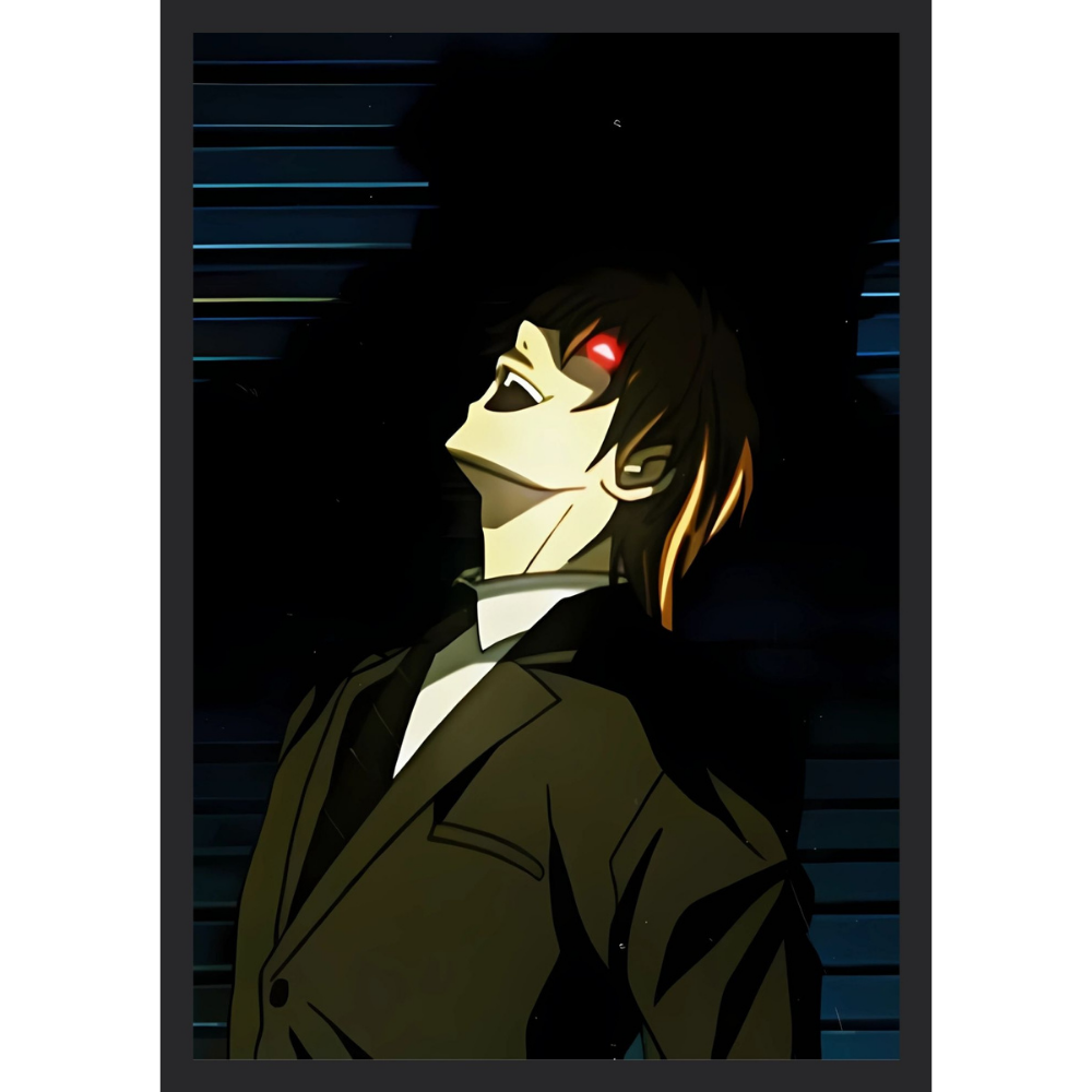 + Free ShippingLight Yagami is shown in a dark, dramatic side profile in a suit, with his eyes glowing crimson red.
