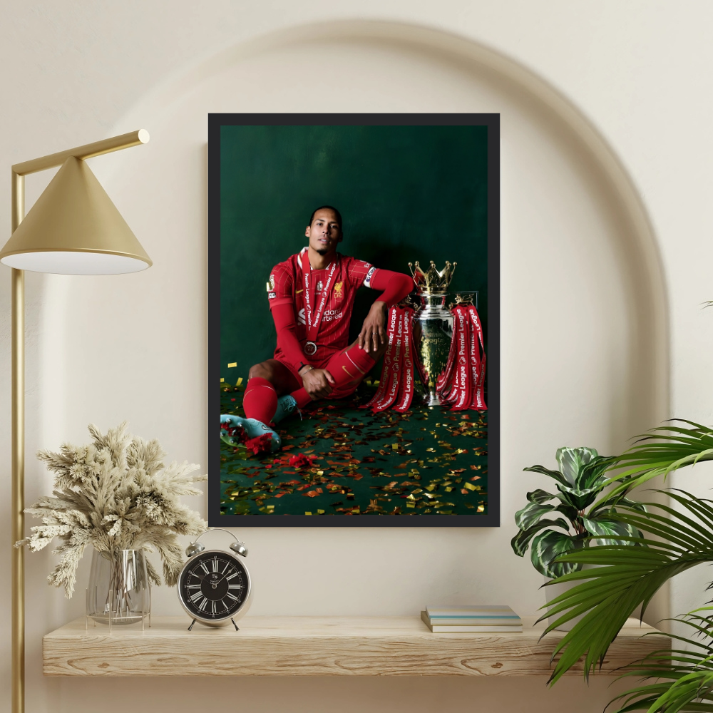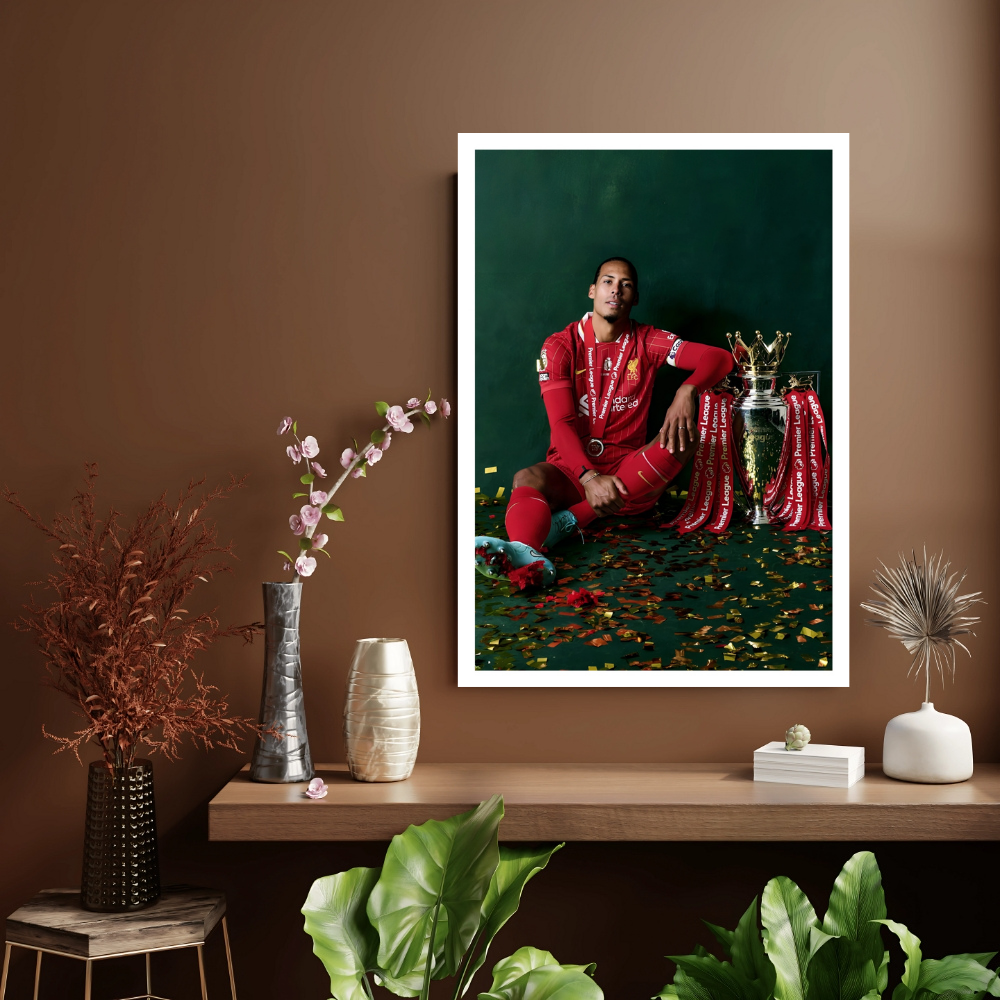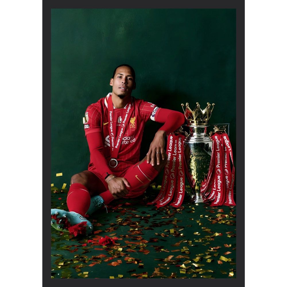 + Free Shipping| Virgil van Dijk sits casually on the floor next to the Premier League trophy, looking relaxed against a dark green background. |