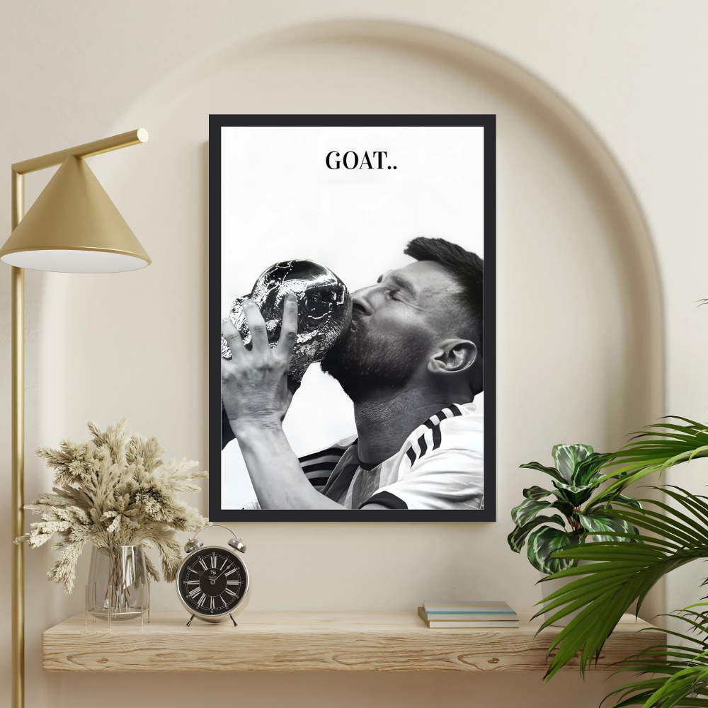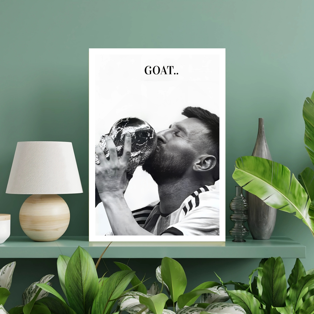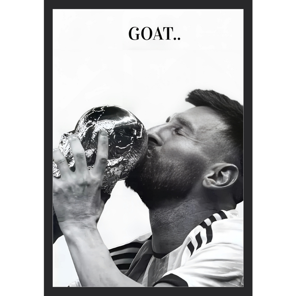 + Free ShippingA black and white close-up of Lionel Messi passionately kissing the FIFA World Cup trophy with the text “GOAT..” above him.