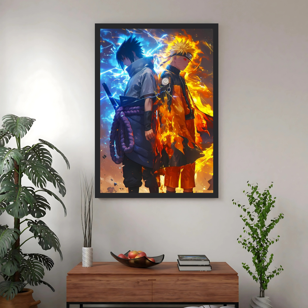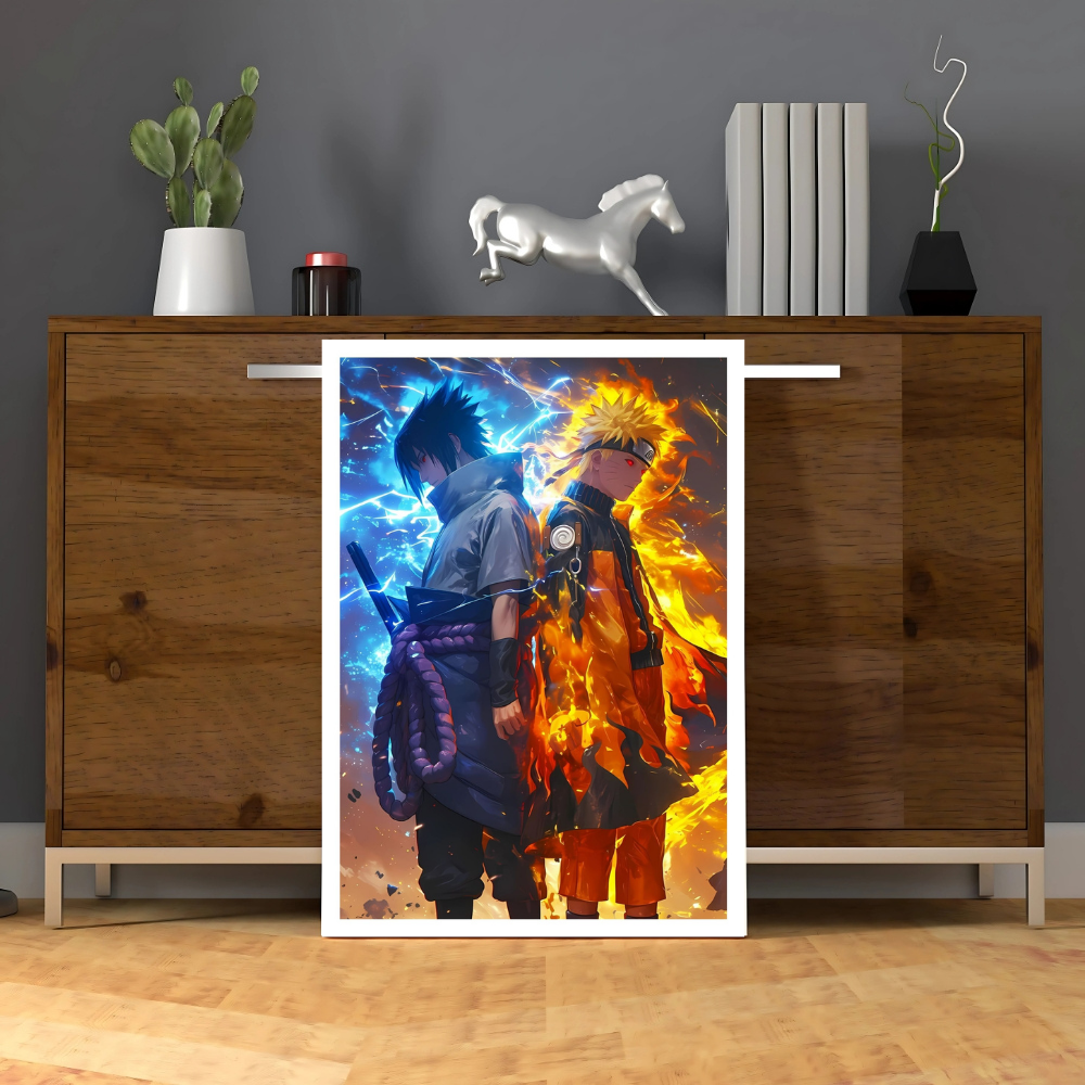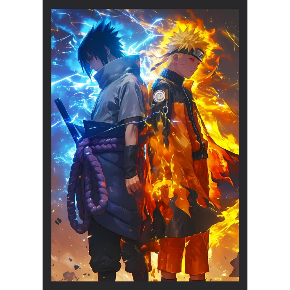 + Free ShippingAn artistic representation of Naruto Uzumaki and Sasuke Uchiha back-to-back, surrounded by fire and lightning.