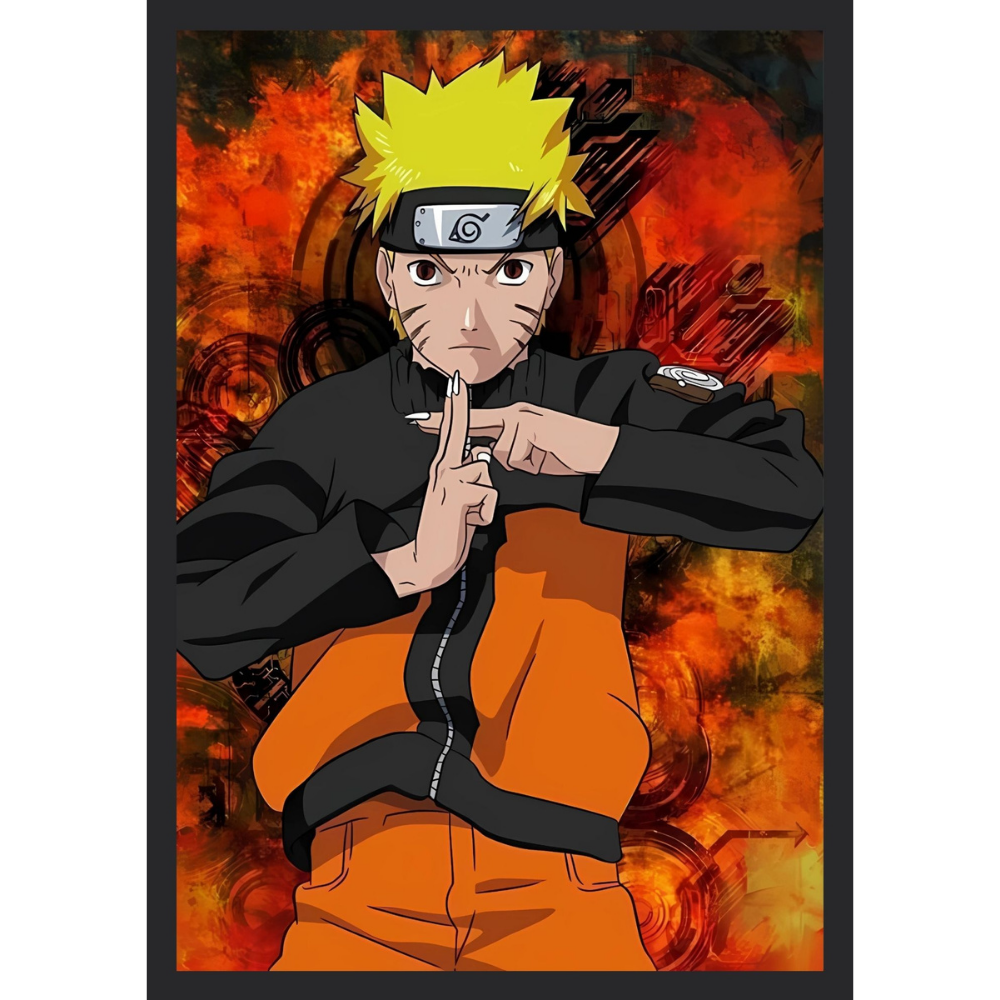 An image of Naruto Uzumaki in his classic black and orange outfit, forming a hand sign against an abstract red background.