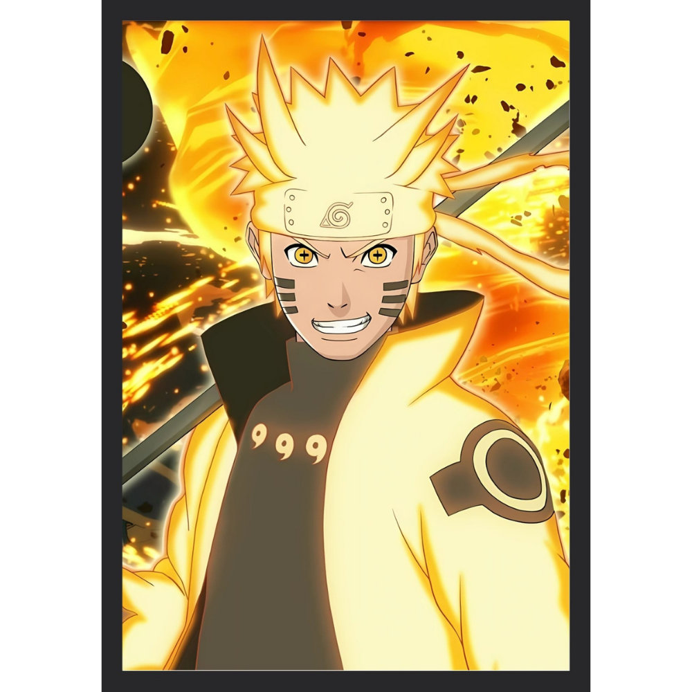 A determined Naruto Uzumaki in an artwork showcasing him glowing in the powerful yellow Kyuubi Chakra Mode.