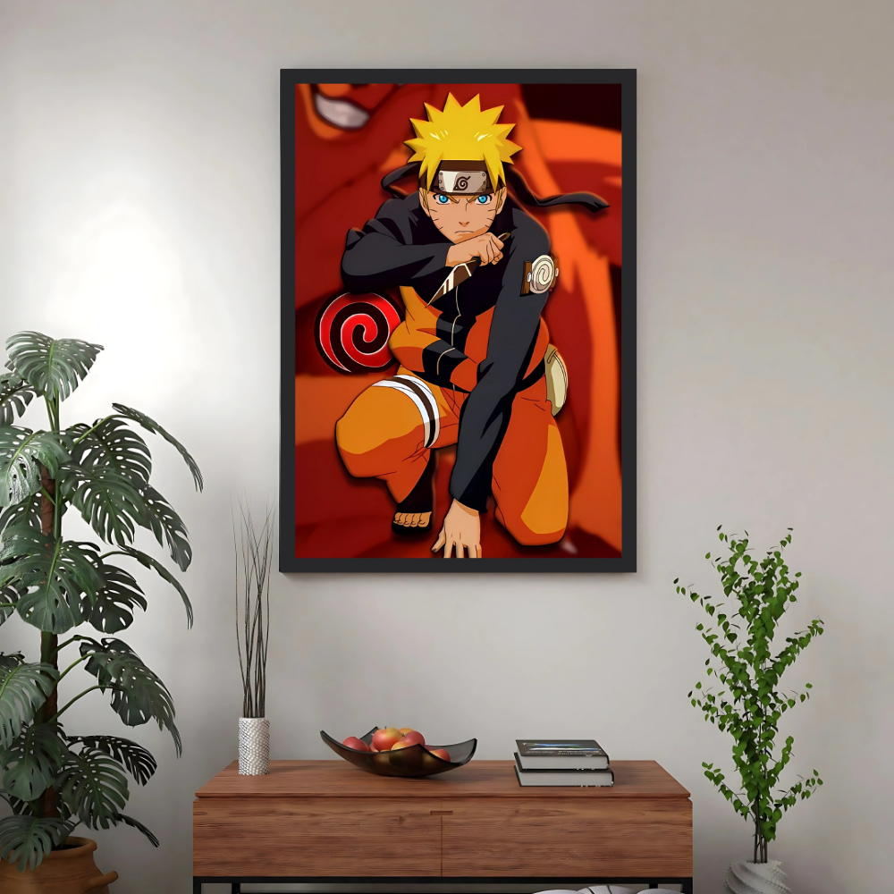 + Free ShippingNaruto Uzumaki kneeling, ready for battle with a weapon/scroll behind him, in front of a red, tailed beast silhouette.