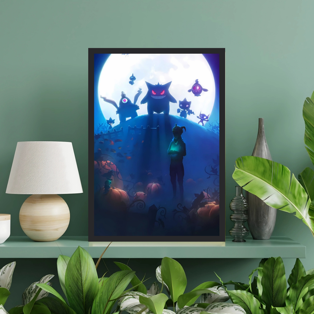 + Free ShippingGengar and other ghost-type Pokémon loom over a trainer on a pumpkin-covered hill under a huge, bright full moon.