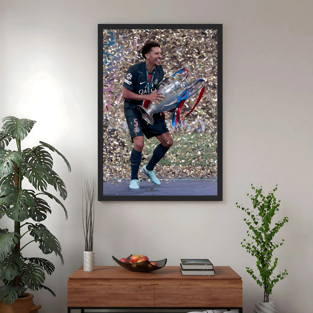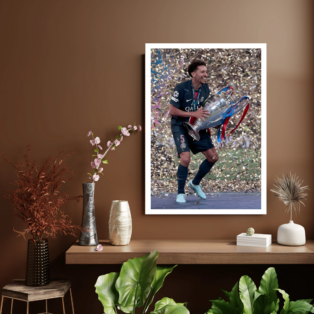 + Free ShippingMarquinhos holds the Champions League trophy and smiles broadly, surrounded by a shower of gold confetti.