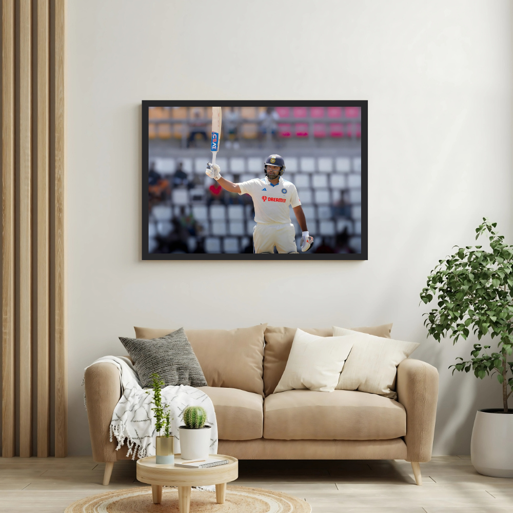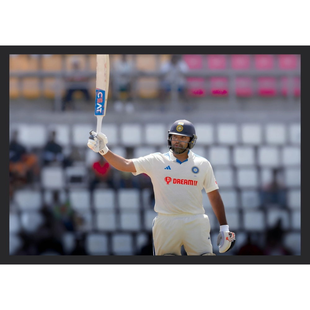 + Free Shipping| Rohit Sharma, in India’s white Test kit, raises his bat in acknowledgment after reaching a milestone in an empty-looking stadium. |