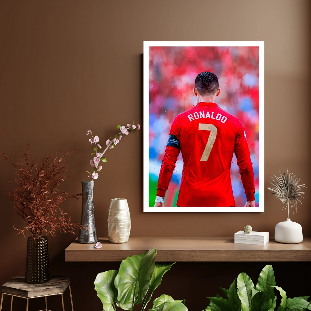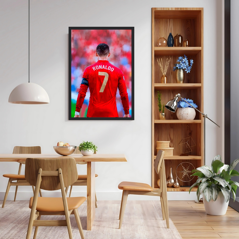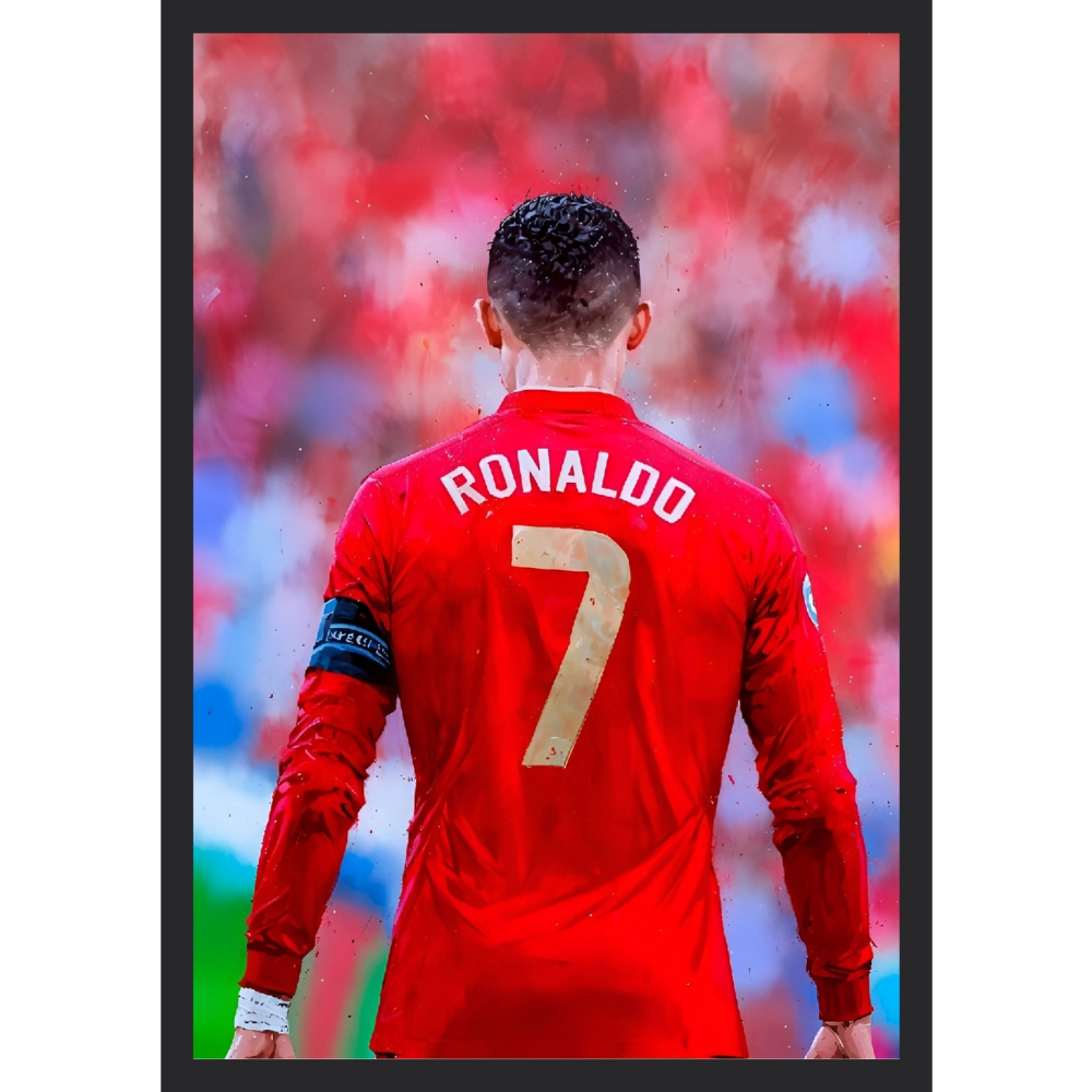 + Free ShippingA back view of Cristiano Ronaldo wearing the red Portugal National Team jersey with his name and the number “7” on his back, facing a crowd.
