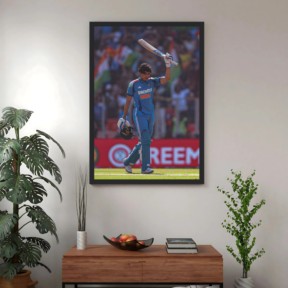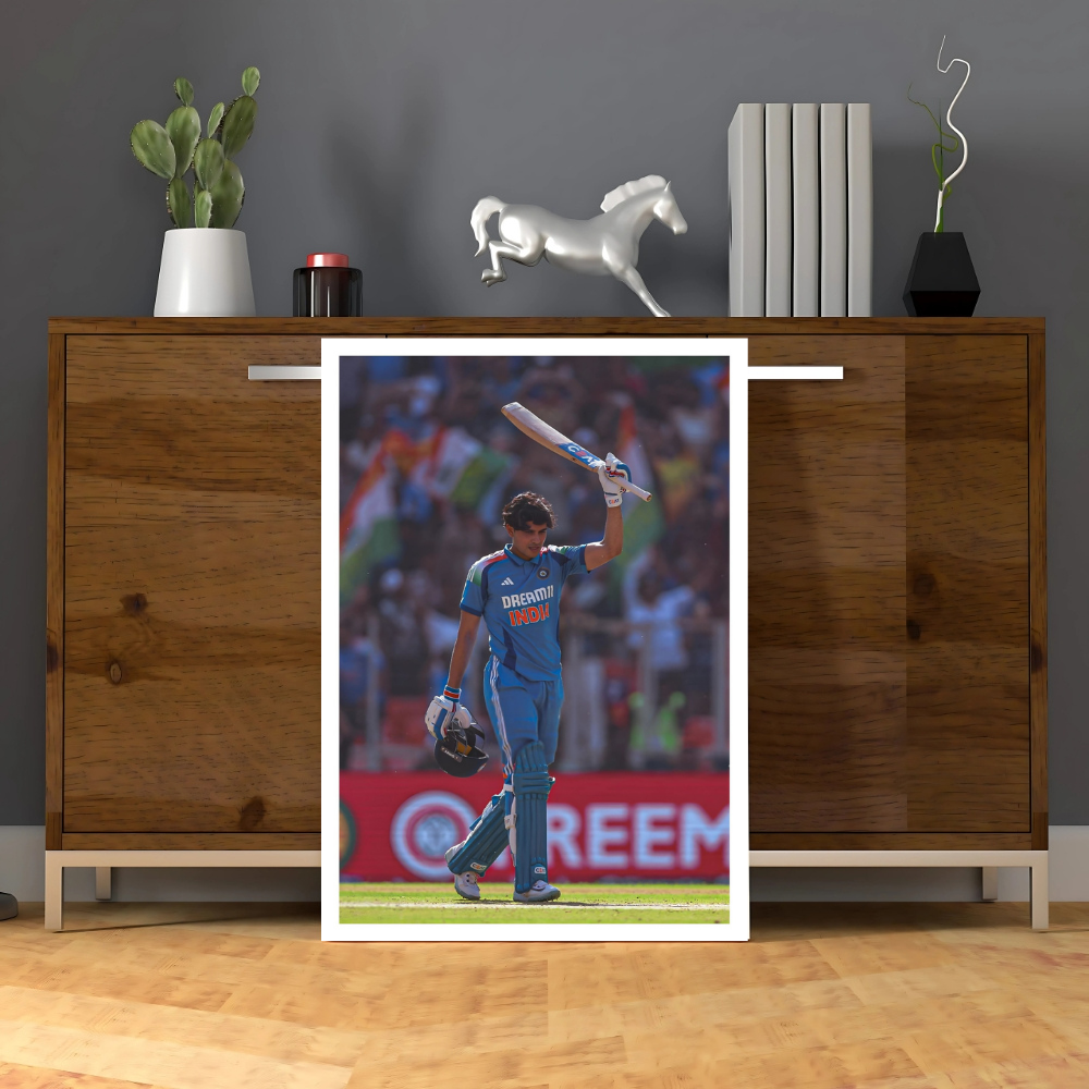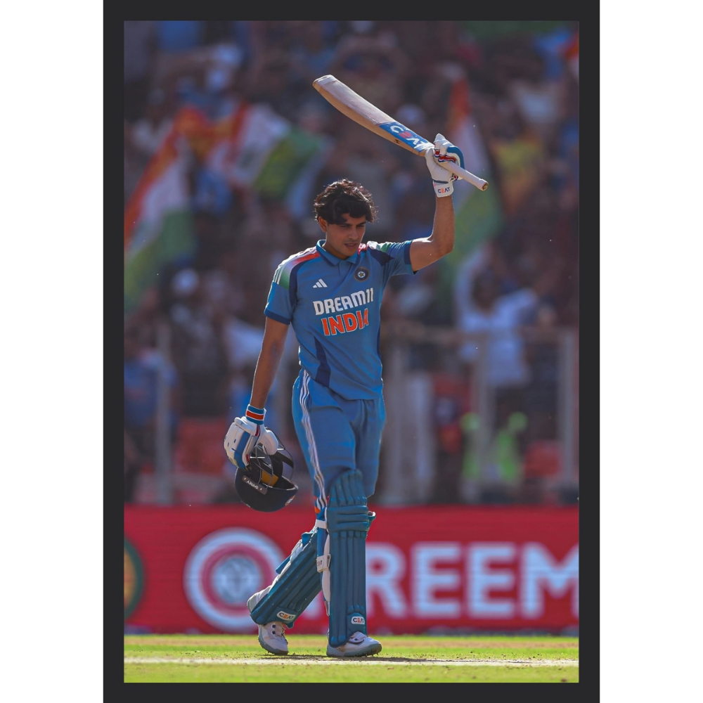 + Free ShippingShubman Gill raises his bat and helmet after reaching a milestone in his India blue uniform.