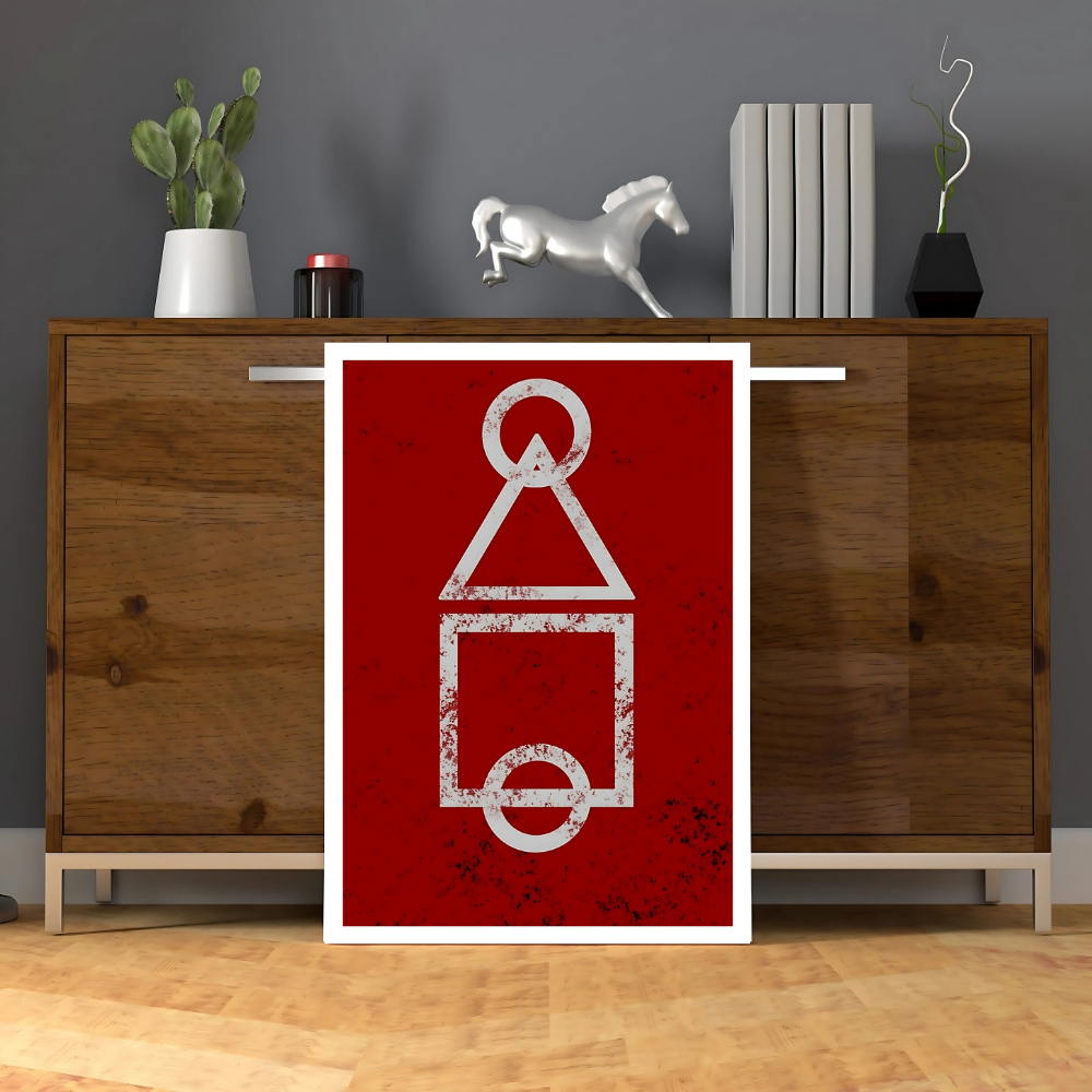 + Free ShippingA rusty red background features a distressed white line image of the three core shapes: circle, triangle, and square, stacked vertically.