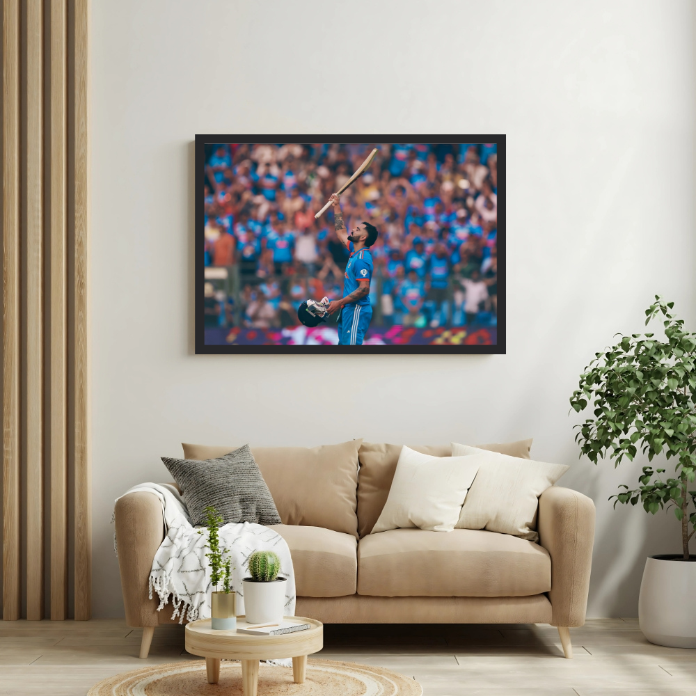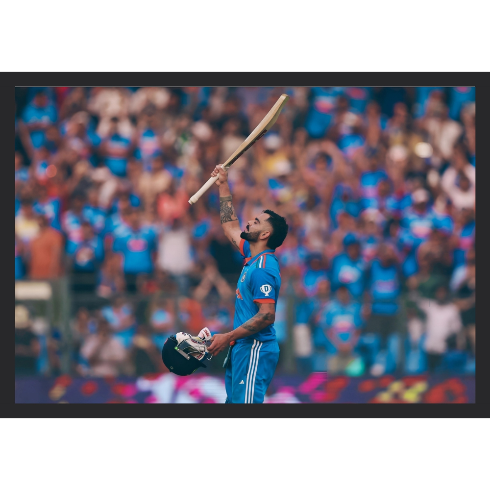 + Free ShippingVirat Kohli raises his cricket bat in celebration after scoring, acknowledging the cheering crowd.